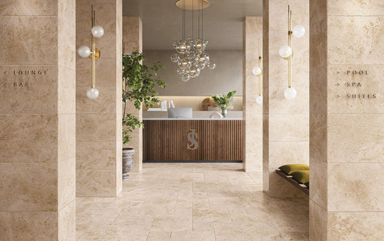 A fabulous stone-effect tile, in modular sizes, which can be used to create busy, rustic floors, or minimal, more contemporary spaces.
